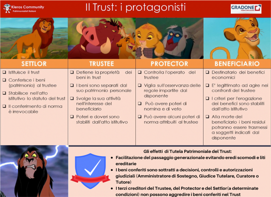 Il trust è uno strumento giuridico di tutela e protezione del patrimonio con il quale un soggetto (il disponente o Settlor) predispone, in un testamento o in un atto tra vivi, i propri beni per il raggiungimento di uno scopo meritevole di tutela specifico, trasferendone la gestione a un altro soggetto (persona di fiducia) chiamato trustee a favore di un terzo soggetto il beneficiario.
