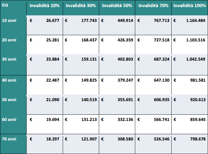 Vediamolo con una tabella sintesi di quella del tribunale che riporta per fasce d’età e danno fisico causato (espresso attraverso percentuali d’invalidità) l’importo spettante al danneggiato.